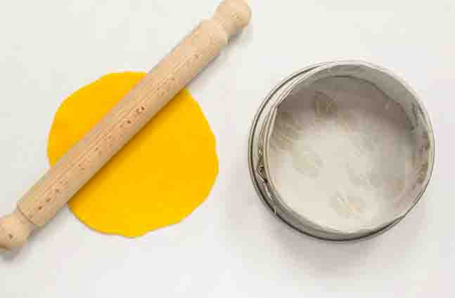 4. Divide the almond paste into three portions and take one portion and roll it into a round the size of the cake tin.