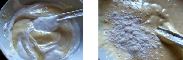 When the egg whites are well incorporated, add the baking powder and the flour in small quantities and mix well. - We must have a smooth and homogeneous mixture